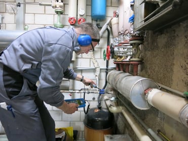 Bild oben: Roger Fehr bei der Kondensatableiterprüfung bei einem Kunden.